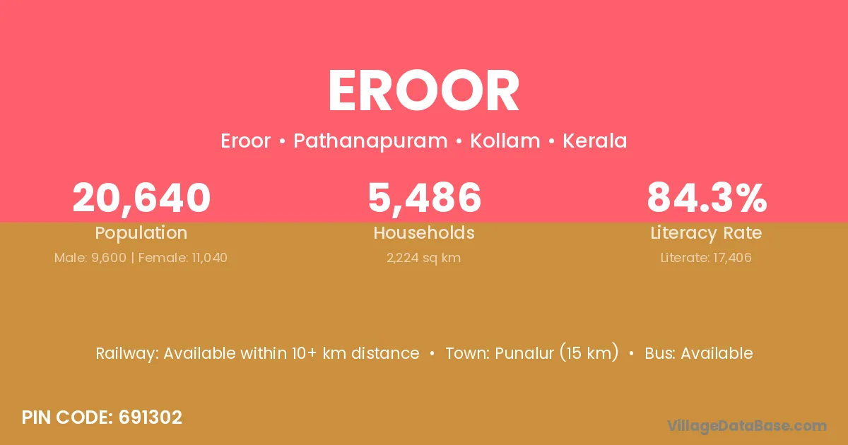 Punalur (15 km) is the nearest town to Eroor village for major economic activities and is located approximately 15 km away.