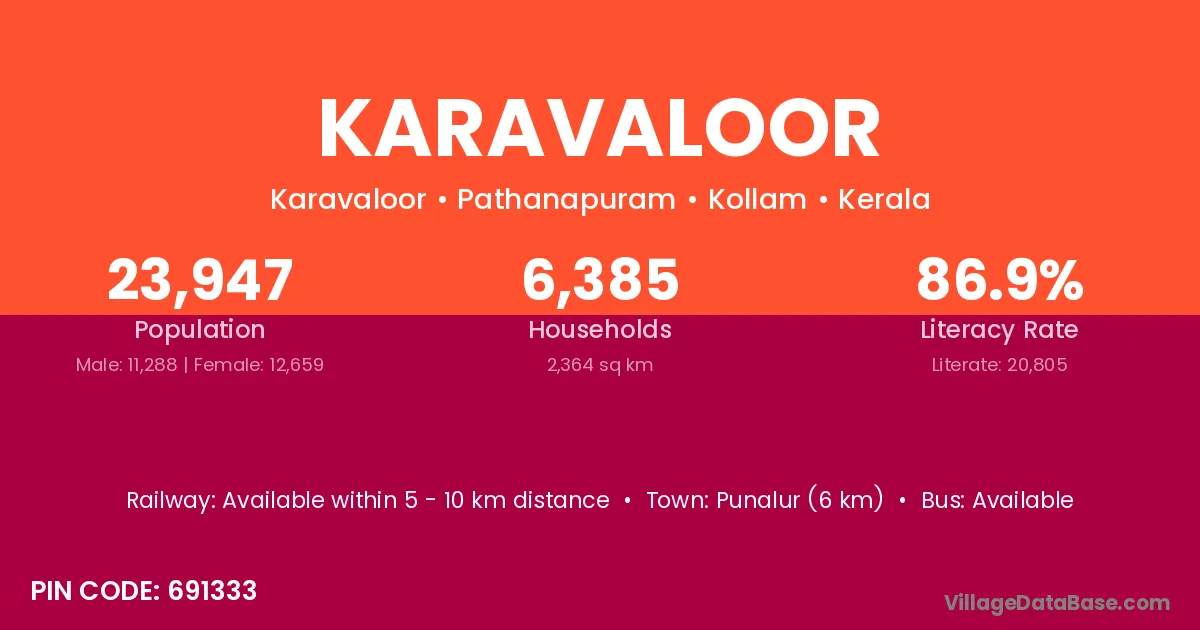 Punalur (6 km) is the nearest town to Karavaloor village for major economic activities and is located approximately 6 km away.