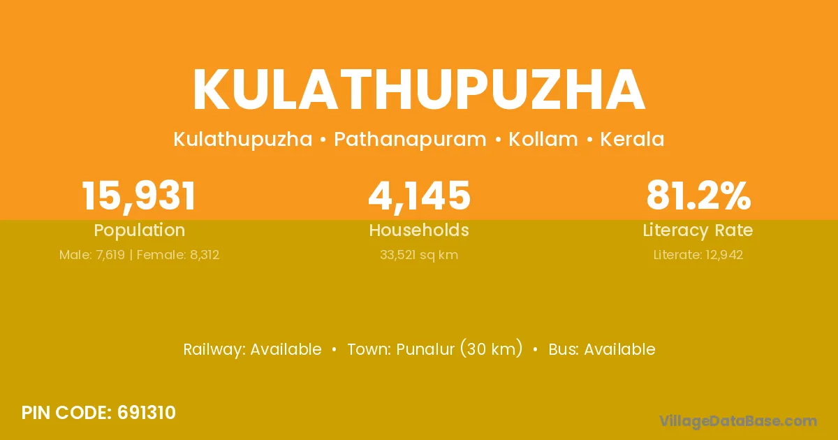 Kulathupuzha village has a total population of 15,931 people, of which 7,619 are males and 8,312 are females.