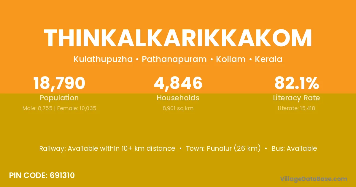 Punalur (26 km) is the nearest town to Thinkalkarikkakom village for major economic activities and is located approximately 26 km away.