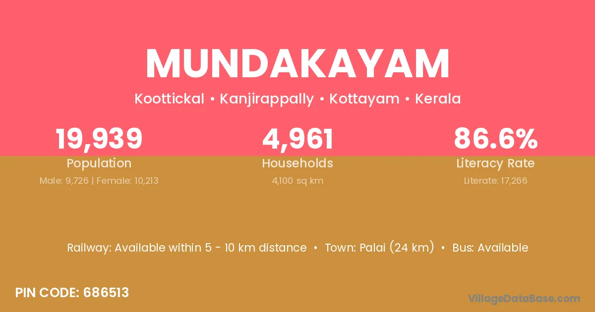 Mundakayam village has a total population of 19,939 people, of which 9,726 are males and 10,213 are females.