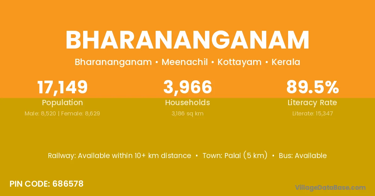 Palai (5 km) is the nearest town to Bharananganam village for major economic activities and is located approximately 5 km away.