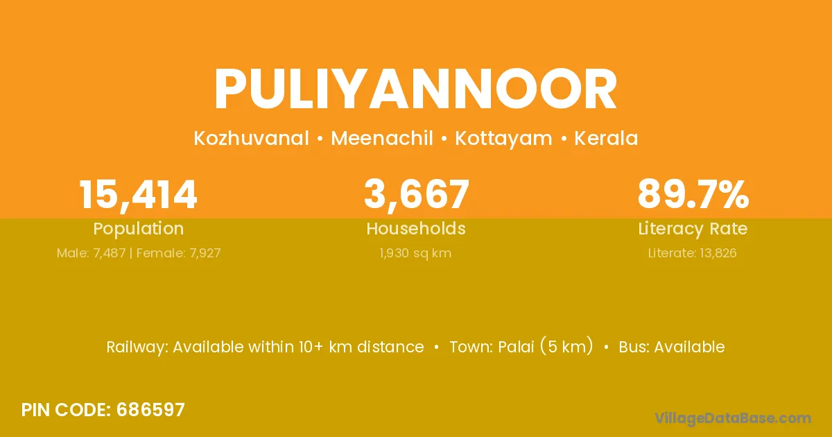 Palai (5 km) is the nearest town to Puliyannoor village for major economic activities and is located approximately 5 km away.