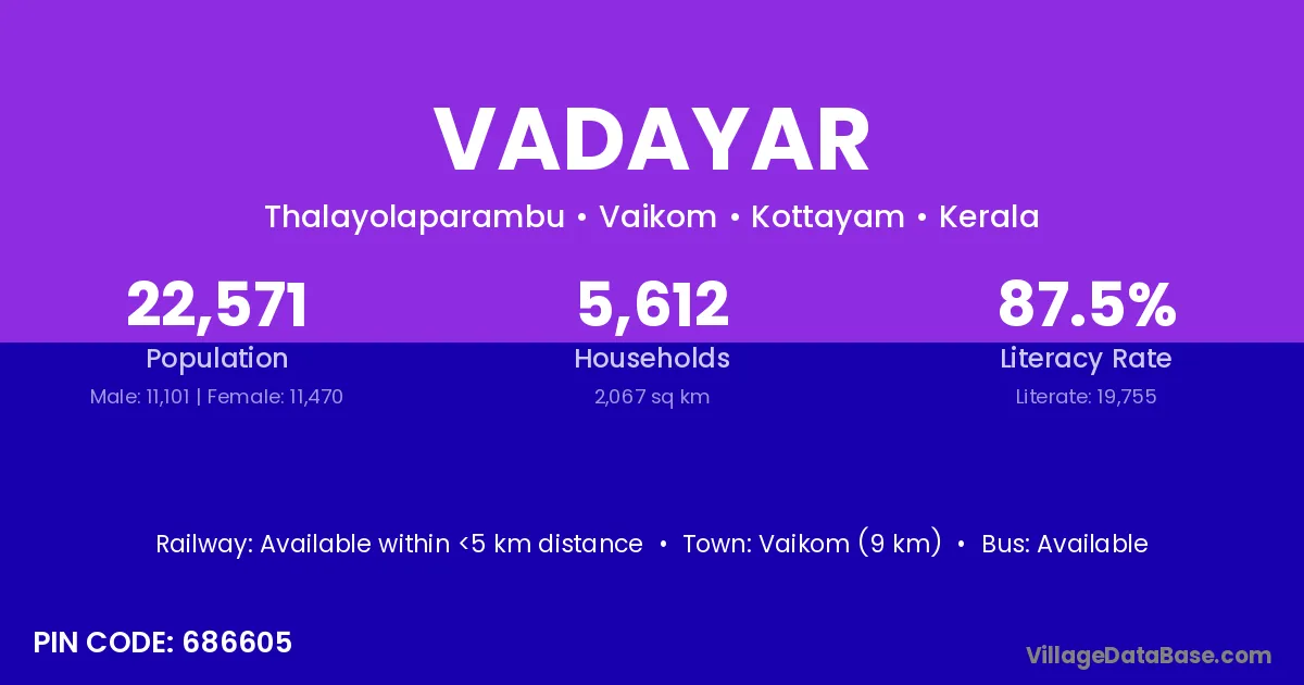Vaikom (9 km) is the nearest town to Vadayar village for major economic activities and is located approximately 9 km away.