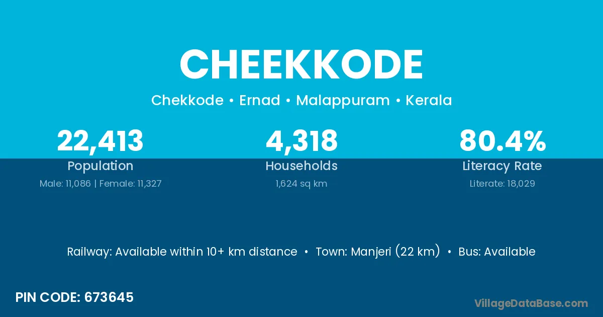 Manjeri (22 km) is the nearest town to Cheekkode village for major economic activities and is located approximately 22 km away.