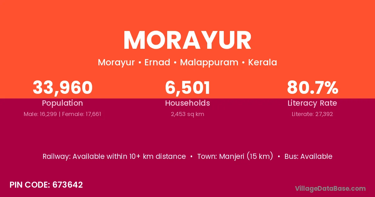 Manjeri (15 km) is the nearest town to Morayur village for major economic activities and is located approximately 15 km away.