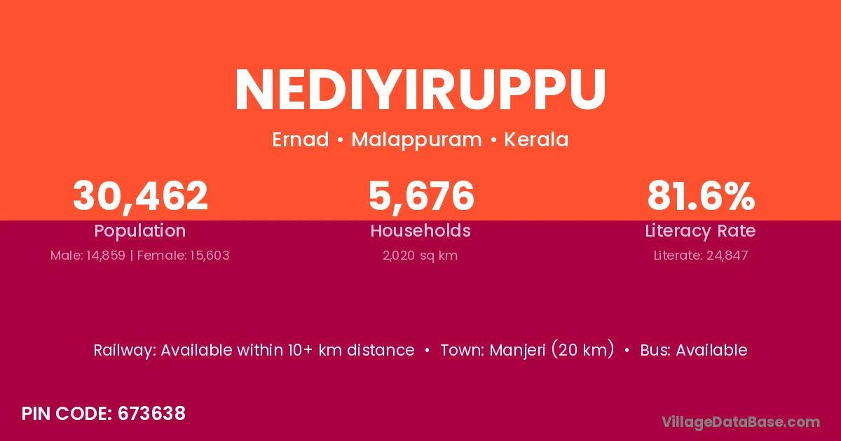 Manjeri (20 km) is the nearest town to Nediyiruppu village for major economic activities and is located approximately 20 km away.