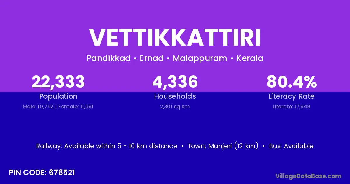 Manjeri (12 km) is the nearest town to Vettikkattiri village for major economic activities and is located approximately 12 km away.