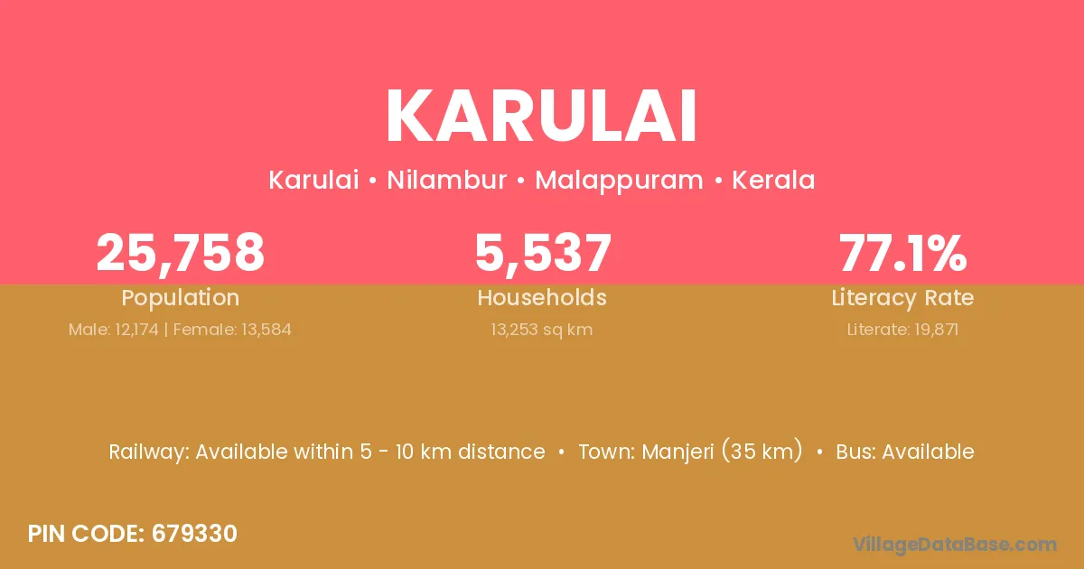 Manjeri (35 km) is the nearest town to Karulai village for major economic activities and is located approximately 35 km away.