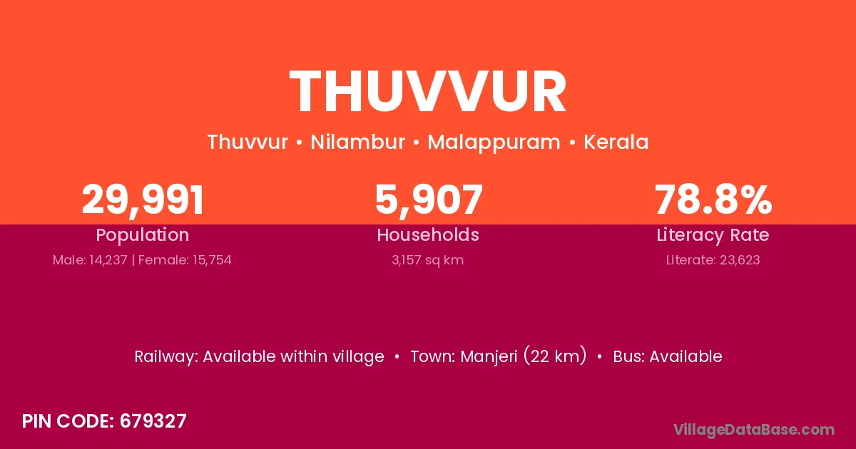 Manjeri (22 km) is the nearest town to Thuvvur village for major economic activities and is located approximately 22 km away.