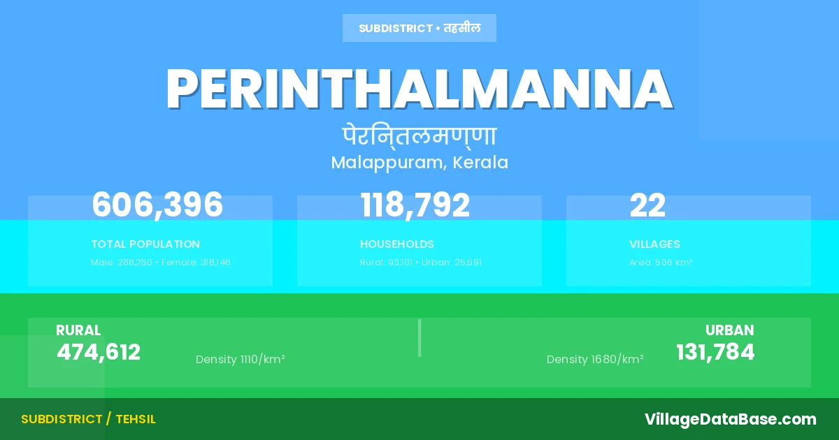 According to the 2011 census The total area of Perinthalmanna Taluka is 506 km², with a population of 606396 people. The population density is 1,199 inhabitants per square kilometre, and there are approximately 118792 houses in the sub district.