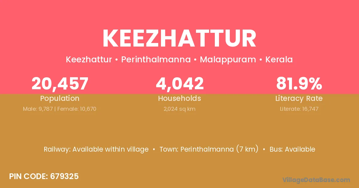 Keezhattur village has a total population of 20,457 people, of which 9,787 are males and 10,670 are females.