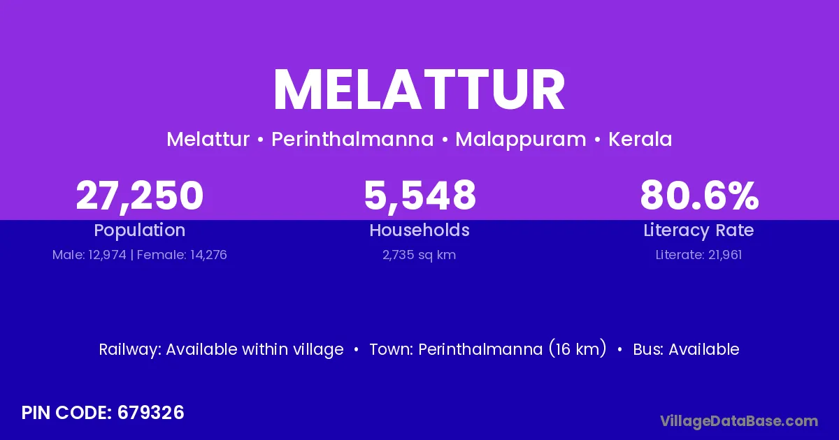 Perinthalmanna (16 km) is the nearest town to Melattur village for major economic activities and is located approximately 16 km away.