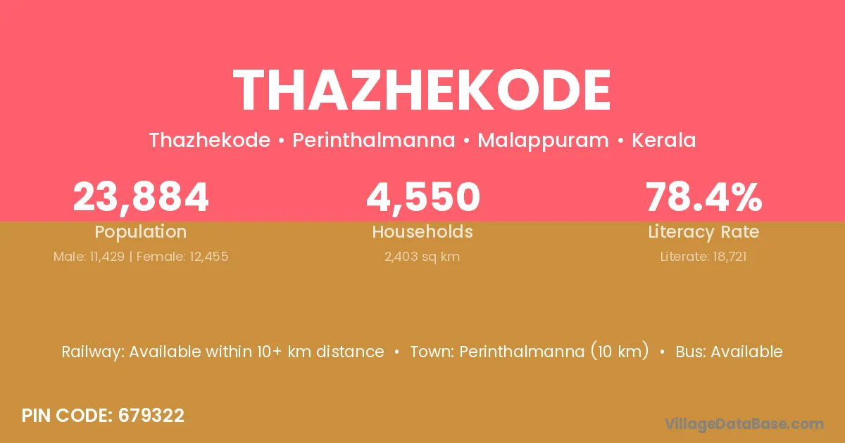 Thazhekode village has a total population of 23,884 people, of which 11,429 are males and 12,455 are females.