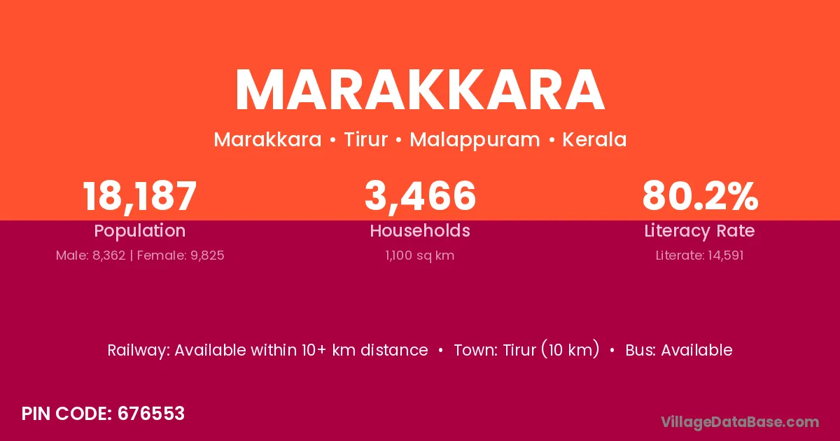 Marakkara village has a total population of 18,187 people, of which 8,362 are males and 9,825 are females.