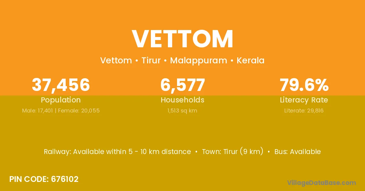 Tirur (9 km) is the nearest town to Vettom village for major economic activities and is located approximately 9 km away.