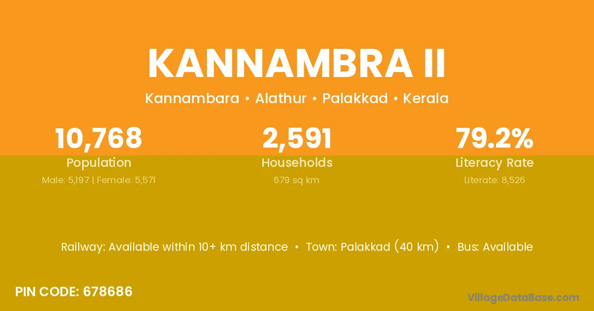 Palakkad (40 km) is the nearest town to Kannambra Ii village for major economic activities and is located approximately 40 km away.