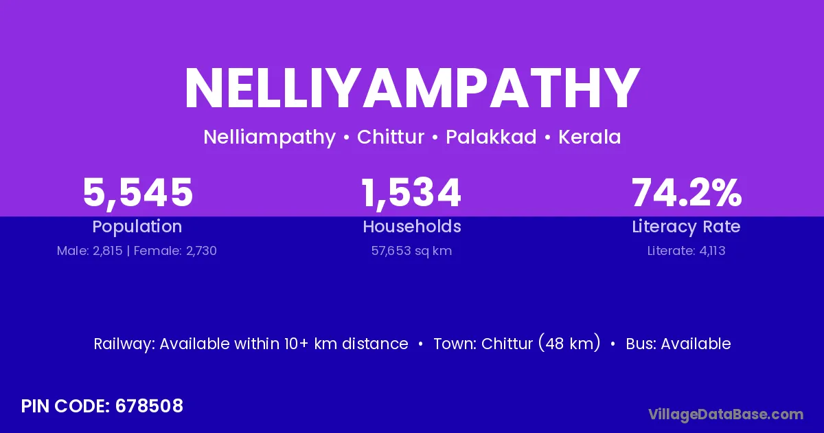 Chittur (48 km) is the nearest town to Nelliyampathy village for major economic activities and is located approximately 48 km away.