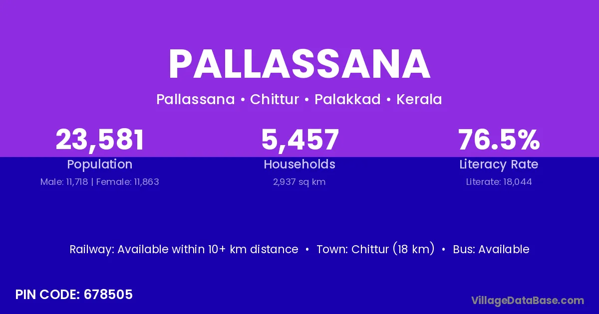Chittur (18 km) is the nearest town to Pallassana village for major economic activities and is located approximately 18 km away.