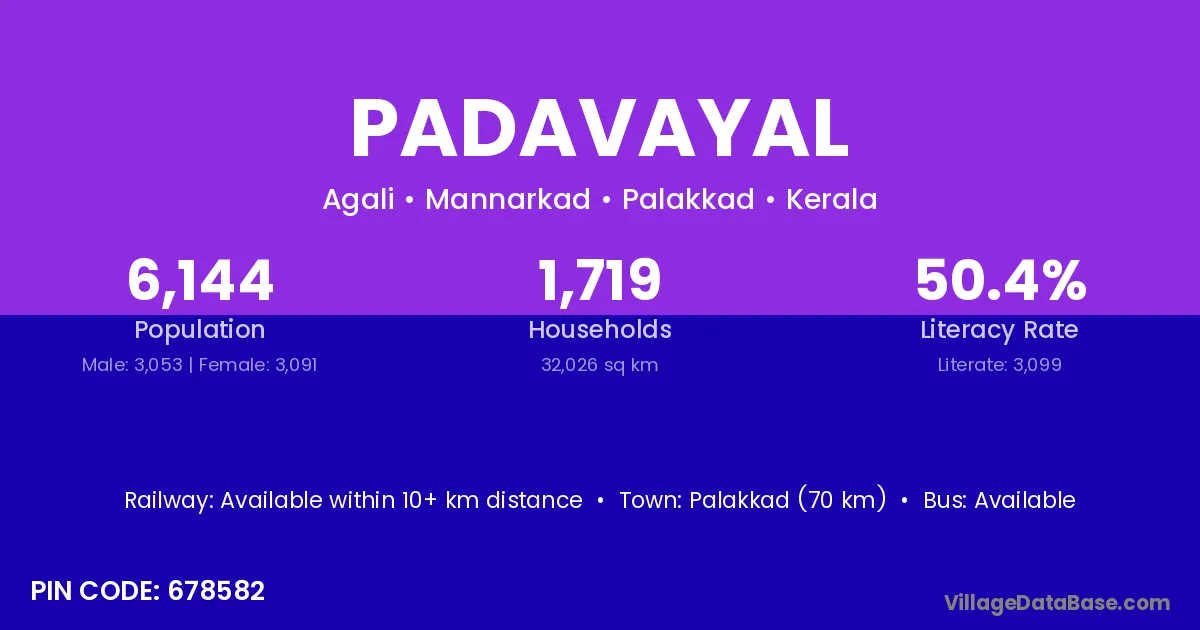 Palakkad (70 km) is the nearest town to Padavayal village for major economic activities and is located approximately 70 km away.