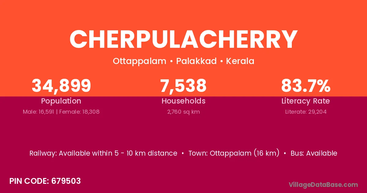 Cherpulacherry village has a total population of 34,899 people, of which 16,591 are males and 18,308 are females.