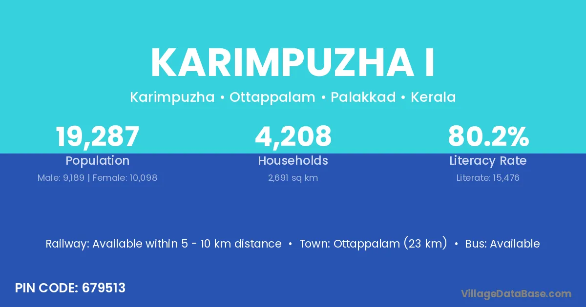 Karimpuzha I village has a total population of 19,287 people, of which 9,189 are males and 10,098 are females.