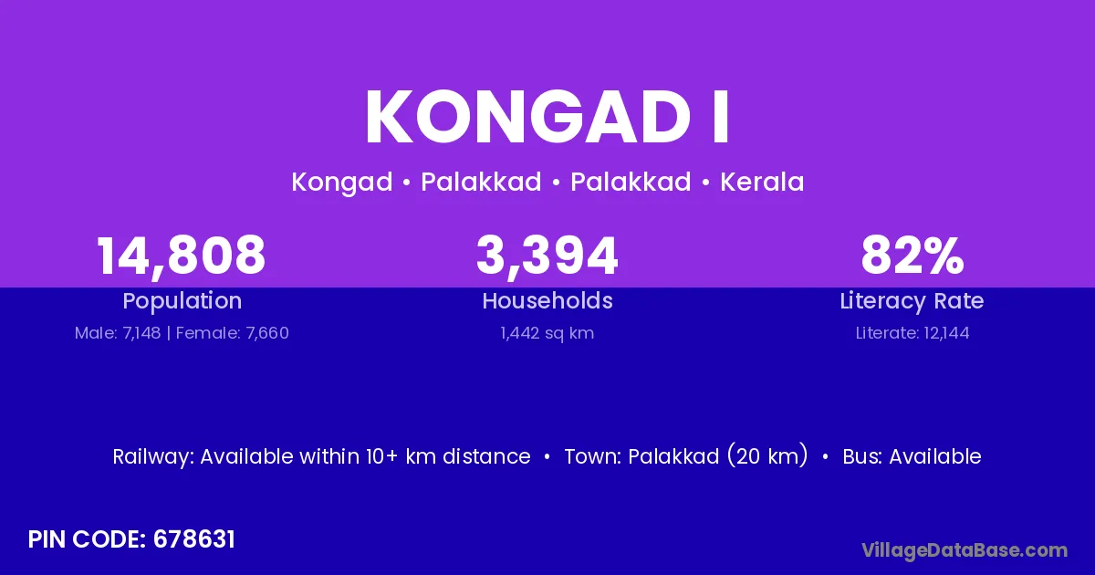 Palakkad (20 km) is the nearest town to Kongad I village for major economic activities and is located approximately 20 km away.