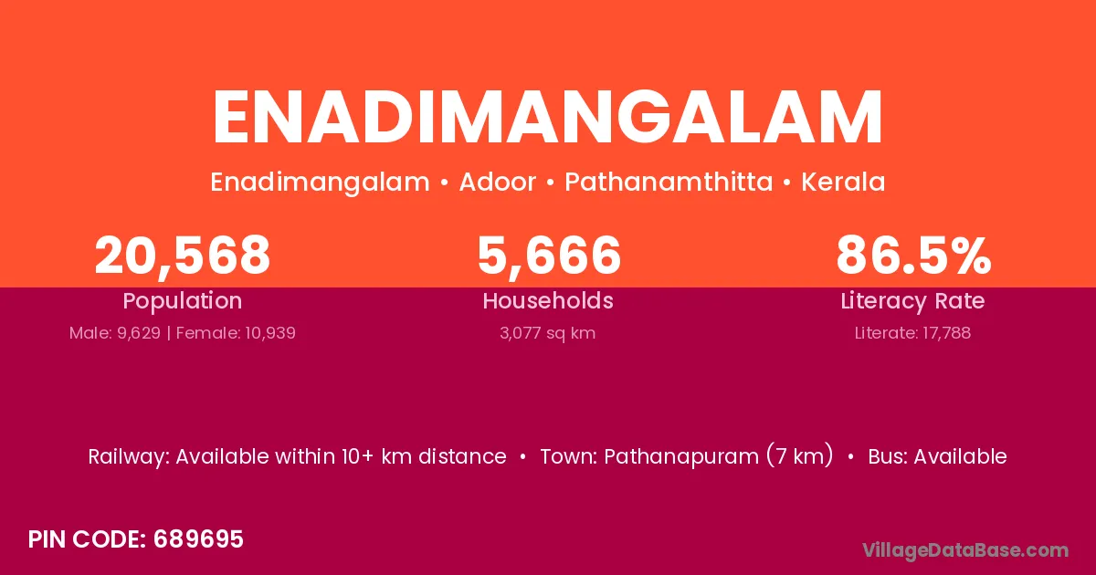 Pathanapuram (7 km) is the nearest town to Enadimangalam village for major economic activities and is located approximately 7 km away.