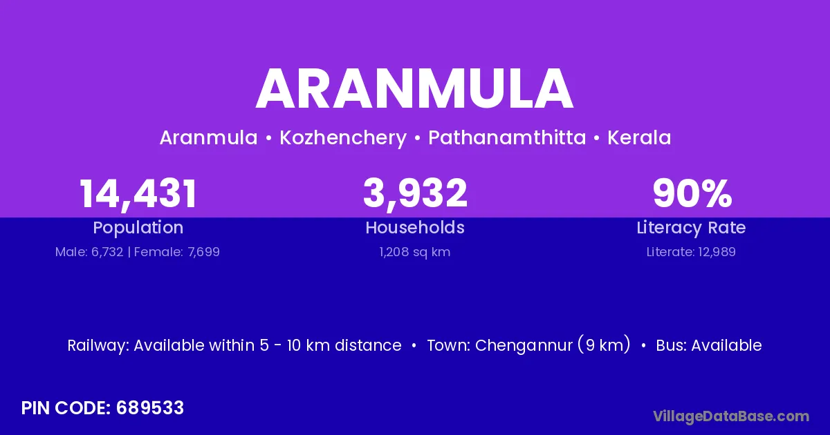 According to Census 2011 information, the village code of Aranmula village is 689533.