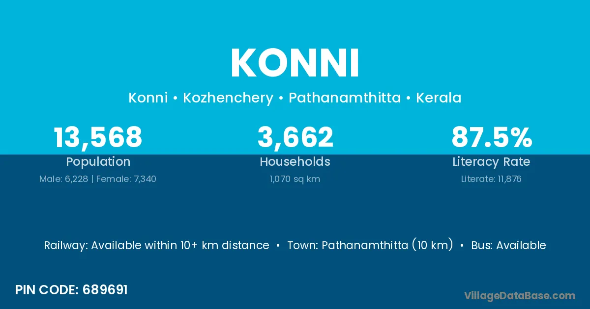 Pathanamthitta (10 km) is the nearest town to Konni village for major economic activities and is located approximately 10 km away.