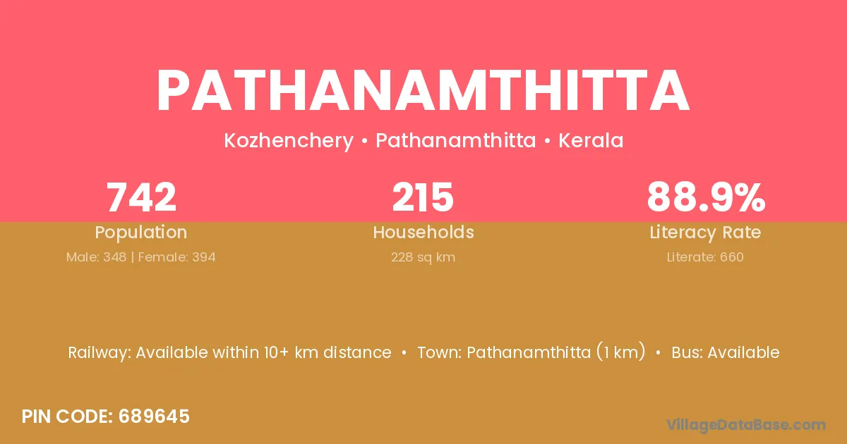 According to Census 2011 information, the village code of Pathanamthitta village is 689645.