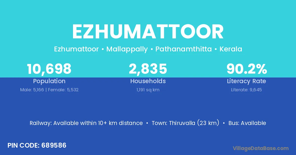 Thiruvalla (23 km) is the nearest town to Ezhumattoor village for major economic activities and is located approximately 23 km away.