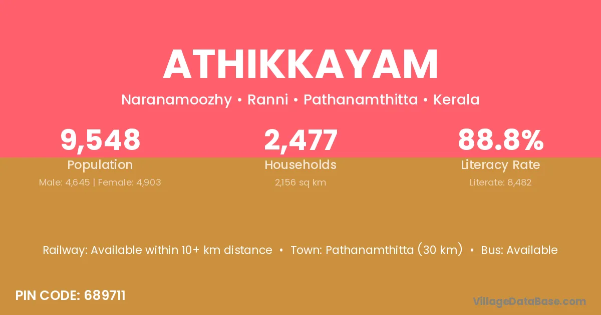 Pathanamthitta (30 km) is the nearest town to Athikkayam village for major economic activities and is located approximately 30 km away.