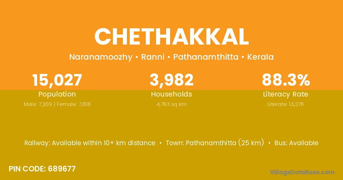 Pathanamthitta (25 km) is the nearest town to Chethakkal village for major economic activities and is located approximately 25 km away.