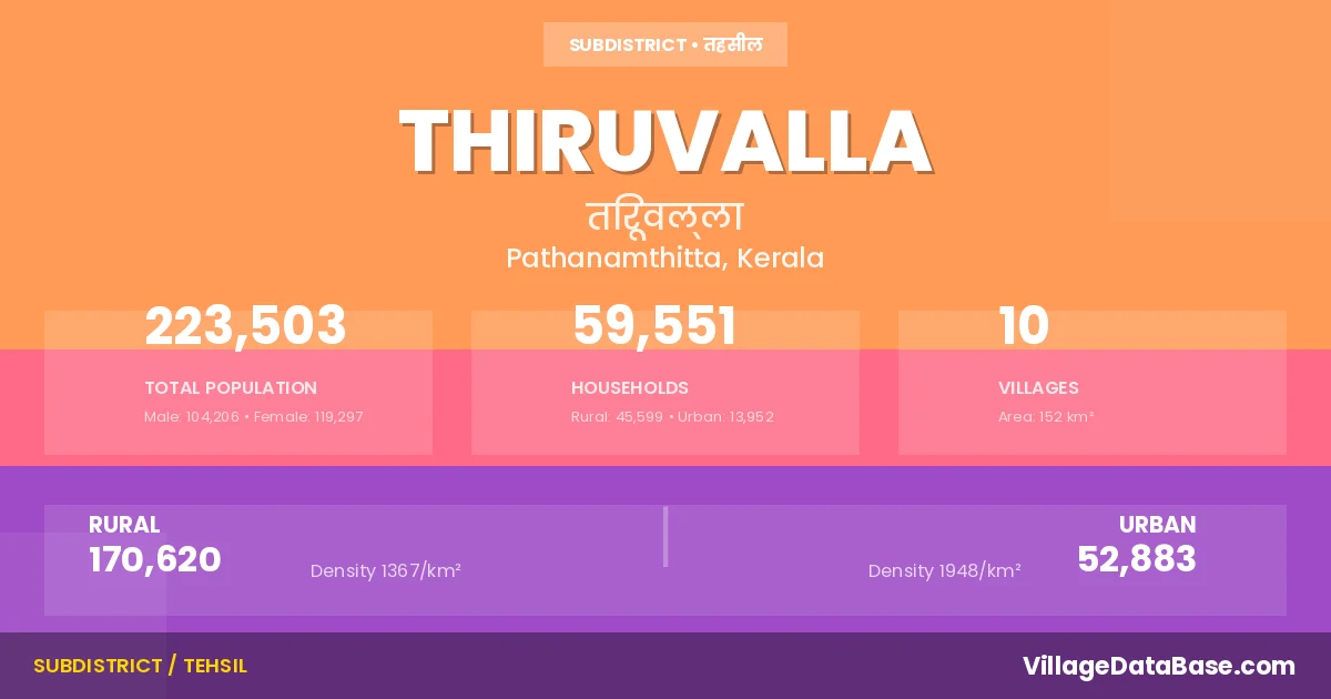According to the 2011 census The total area of Thiruvalla Taluka is 152 km², with a population of 223503 people. The population density is 1,471 inhabitants per square kilometre, and there are approximately 59551 houses in the sub district.