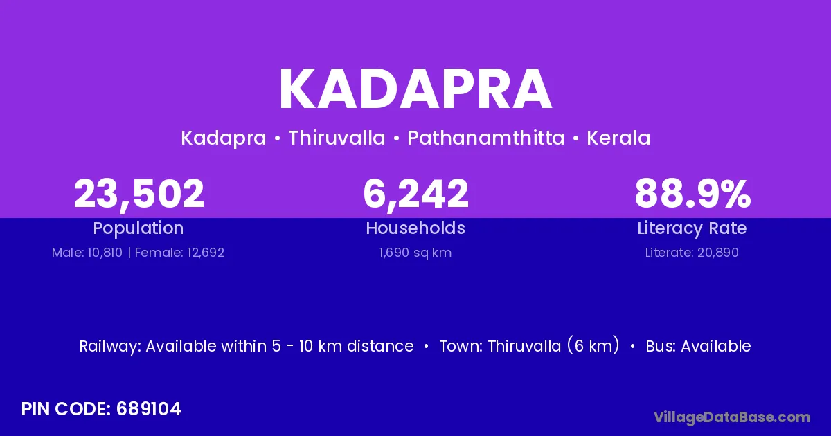 Thiruvalla (6 km) is the nearest town to Kadapra village for major economic activities and is located approximately 6 km away.