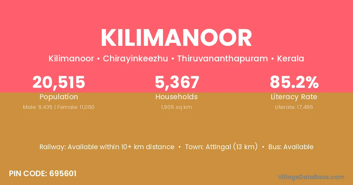 Attingal (13 km) is the nearest town to Kilimanoor village for major economic activities and is located approximately 13 km away.