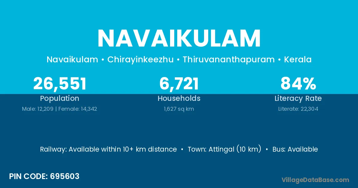 Attingal (10 km) is the nearest town to Navaikulam village for major economic activities and is located approximately 10 km away.