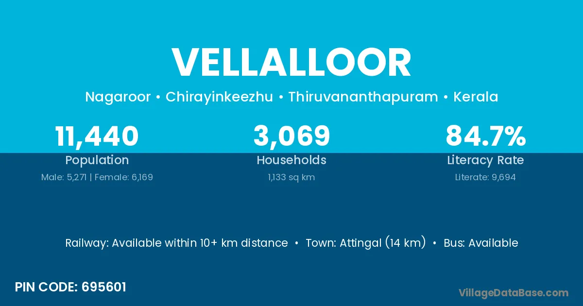 Attingal (14 km) is the nearest town to Vellalloor village for major economic activities and is located approximately 14 km away.