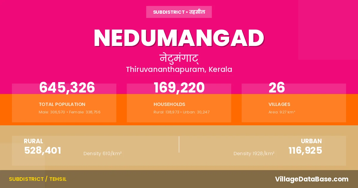 According to the 2011 census The total area of Nedumangad Taluka is 927 km², with a population of 645326 people. The population density is 696 inhabitants per square kilometre, and there are approximately 169220 houses in the sub district.