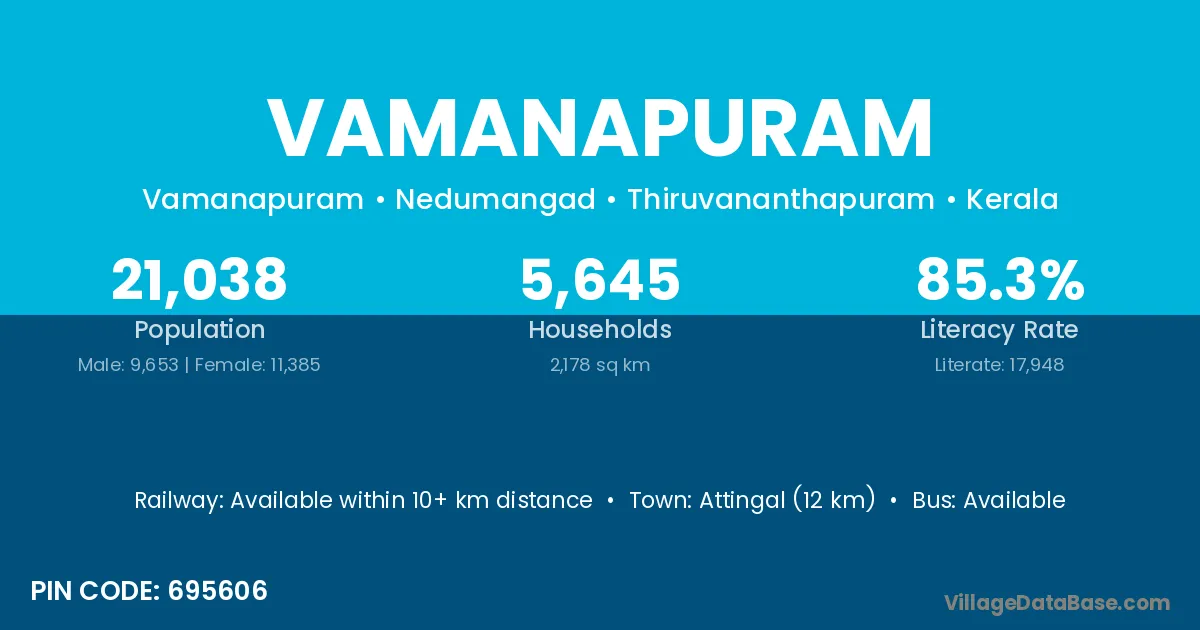 Vamanapuram village has a total population of 21,038 people, of which 9,653 are males and 11,385 are females.