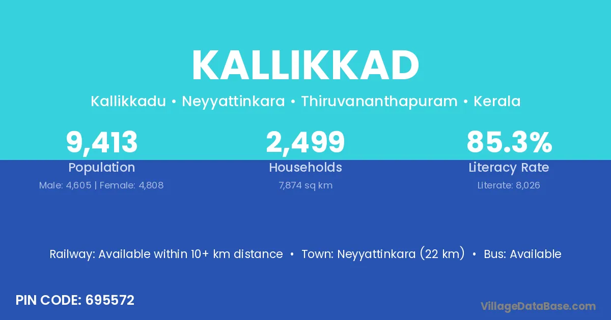 Neyyattinkara (22 km) is the nearest town to Kallikkad village for major economic activities and is located approximately 22 km away.