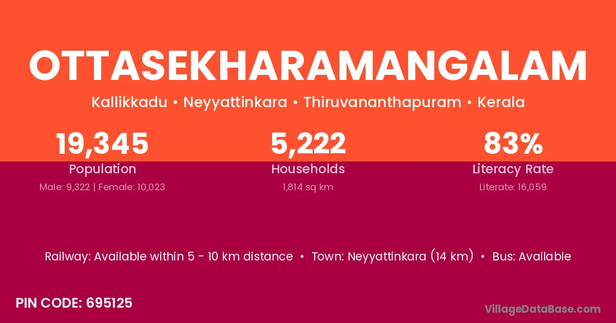 Neyyattinkara (14 km) is the nearest town to Ottasekharamangalam village for major economic activities and is located approximately 14 km away.