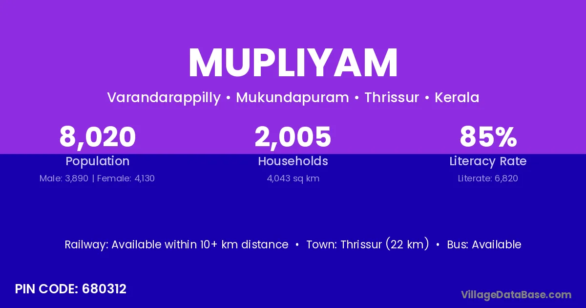 Thrissur (22 km) is the nearest town to Mupliyam village for major economic activities and is located approximately 22 km away.