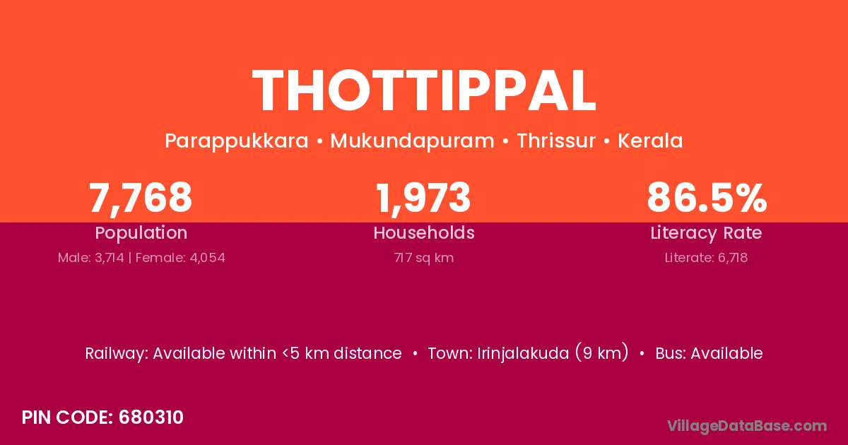 Irinjalakuda (9 km) is the nearest town to Thottippal village for major economic activities and is located approximately 9 km away.