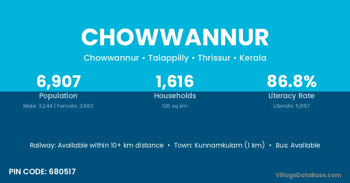 Kunnamkulam (1 km) is the nearest town to Chowwannur village for major economic activities and is located approximately 1 km away.