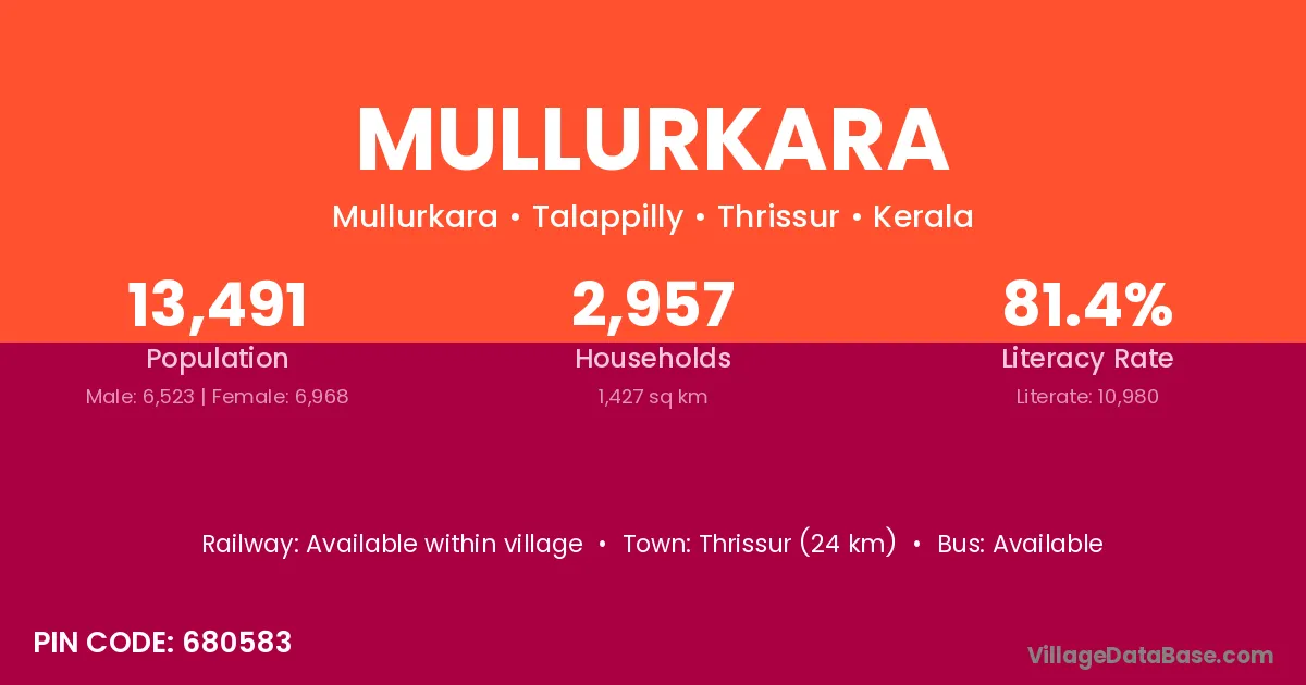 Mullurkara village has a total population of 13,491 people, of which 6,523 are males and 6,968 are females.