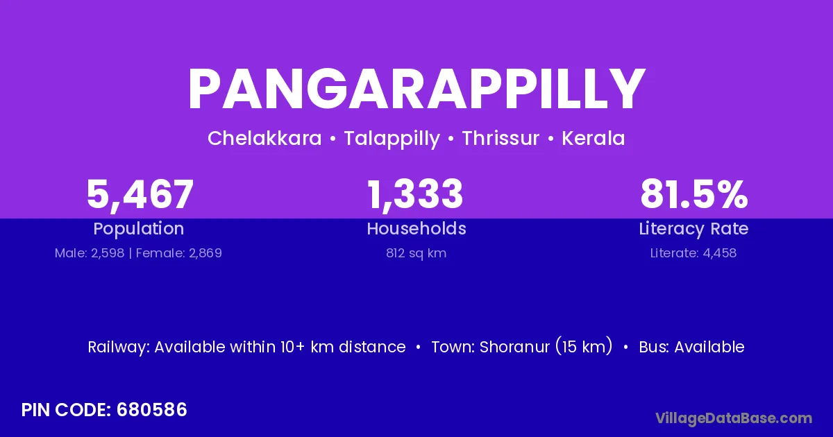 Shoranur (15 km) is the nearest town to Pangarappilly village for major economic activities and is located approximately 15 km away.