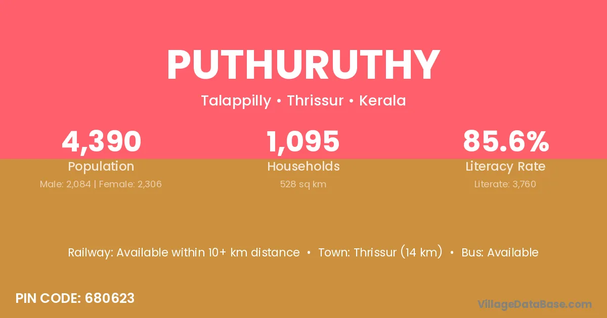 Thrissur (14 km) is the nearest town to Puthuruthy village for major economic activities and is located approximately 14 km away.