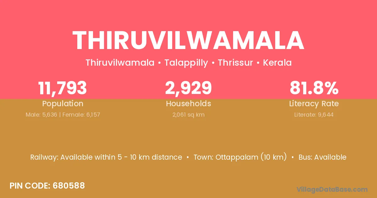 Thiruvilwamala village has a total population of 11,793 people, of which 5,636 are males and 6,157 are females.